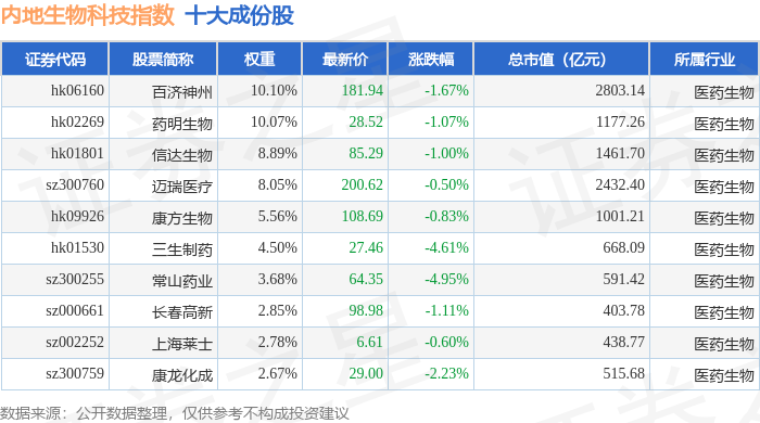内地生物科技(983101)指数十大成份股详情如下: