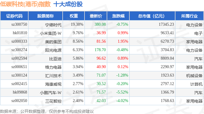 低碳科技(港币)(983161)指数十大成份股详情如下: