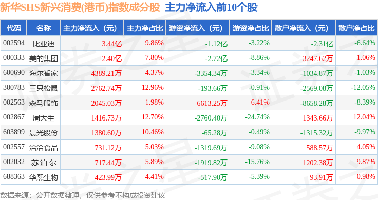 资金流向方面,新华SHS新兴消费(港币)(989007)指数成份股当日主力资金净流出合计4.94亿元,游资资金净流出合计1.73亿元,散户资金净流入合计6.66亿元。成份股资金流向详情见下表: