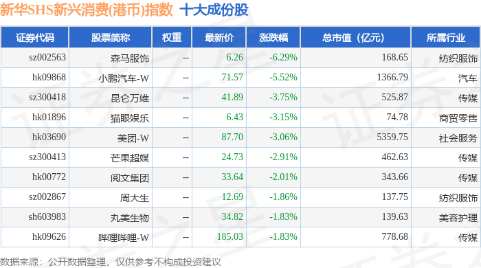 新华SHS新兴消费(港币)(989007)指数十大成份股详情如下: