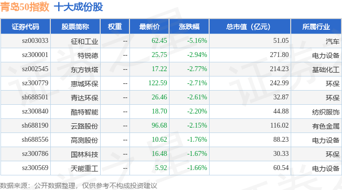 证券之星消息,12月2日,青岛50(989011)指数报收于2374.37点,跌0.09%,成交69.99亿元,换手率1.16%。当日该指数成份股中,上涨的有14家,冠中生态以4.79%的涨幅领涨,下跌的有27家,征和工业以5.16%的跌幅领跌。