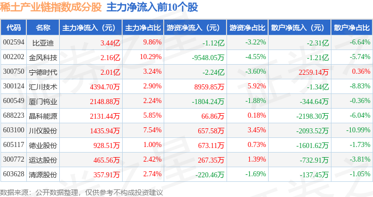 资金流向方面,稀土产业链(989013)指数成份股当日主力资金净流出合计23.04亿元,游资资金净流入合计1.65亿元,散户资金净流入合计21.39亿元。成份股资金流向详情见下表: