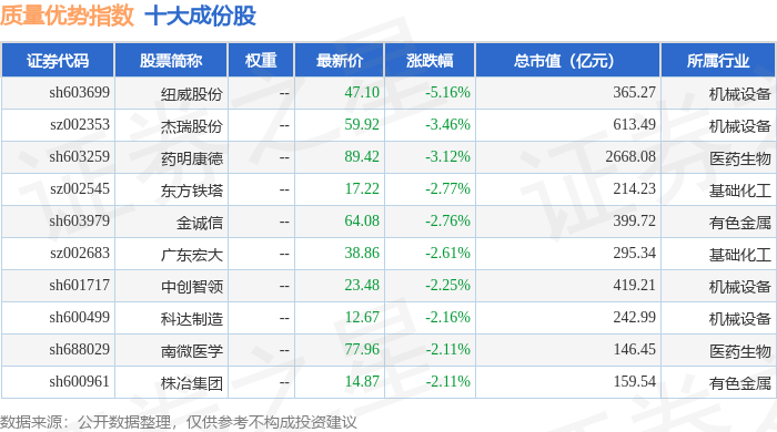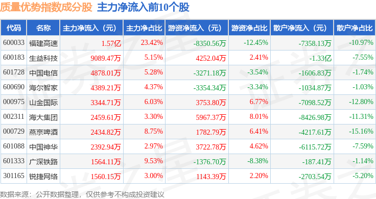 资金流向方面,质量优势(989017)指数成份股当日主力资金净流出合计20.0亿元,游资资金净流入合计9.52亿元,散户资金净流入合计10.48亿元。成份股资金流向详情见下表: