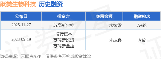 证券之星消息,根据天眼查APP于11月27日公布的信息整理,跃美生物科技(苏州)有限公司A+轮融资,融资额未披露,参与投资的机构包括苏高新金控。