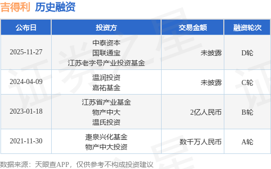 证券之星消息,根据天眼查APP于11月27日公布的信息整理,江苏吉得利食品有限公司D轮融资,融资额未披露,参与投资的机构包括中泰资本,国联通宝,江苏老字号产业投资基金。