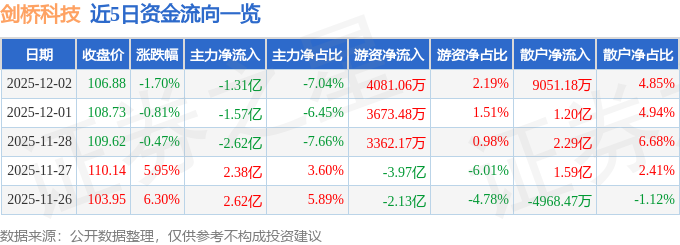 证券之星消息,截至2025年12月2日收盘,剑桥科技(603083)报收于106.88元,下跌1.7%,换手率6.28%,成交量17.3万手,成交额18.66亿元。