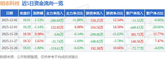 证券之星消息,截至2025年12月2日收盘,明志科技(688355)报收于18.01元,下跌1.53%,换手率0.78%,成交量9646.0手,成交额1739.91万元。