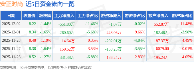 证券之星消息,截至2025年12月2日收盘,安正时尚(603839)报收于8.22元,下跌1.44%,换手率1.5%,成交量5.85万手,成交额4813.97万元。