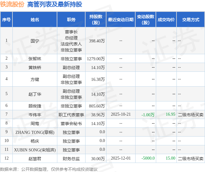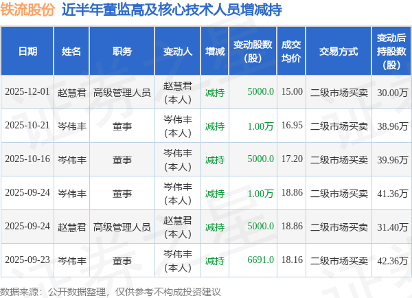 铁流股份近半年内的董监高及核心技术人员增减持详情如下: