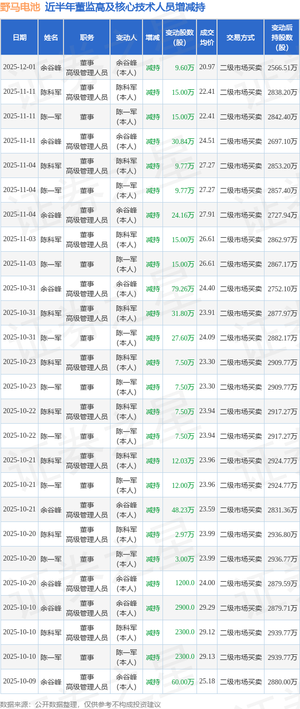 野马电池近半年内的董监高及核心技术人员增减持详情如下: