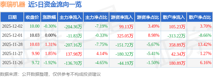 证券之星消息,截至2025年12月2日收盘,泰瑞机器(603289)报收于10.0元,下跌0.3%,换手率0.97%,成交量2.85万手,成交额2843.51万元。