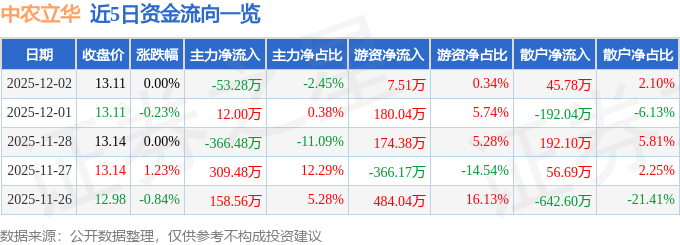 证券之星消息,截至2025年12月2日收盘,中农立华(603970)报收于13.11元,上涨0.0%,换手率0.62%,成交量1.67万手,成交额2178.67万元。