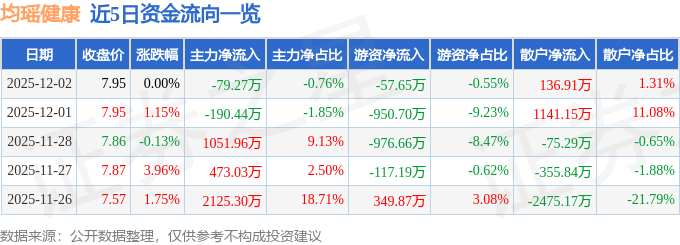 证券之星消息,截至2025年12月2日收盘,均瑶健康(605388)报收于7.95元,上涨0.0%,换手率2.19%,成交量13.15万手,成交额1.05亿元。