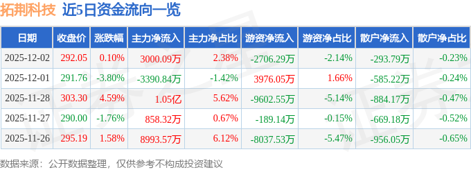 证券之星消息,截至2025年12月2日收盘,拓荆科技(688072)报收于292.05元,上涨0.1%,换手率1.53%,成交量4.31万手,成交额12.63亿元。