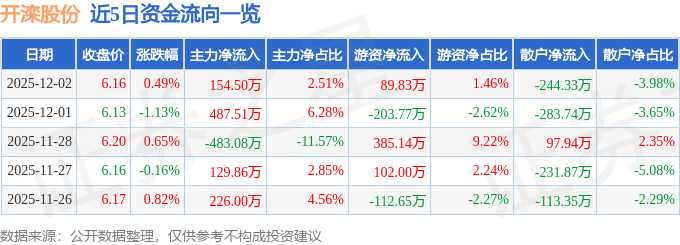 证券之星消息,截至2025年12月2日收盘,开滦股份(600997)报收于6.16元,上涨0.49%,换手率0.63%,成交量9.99万手,成交额6146.61万元。