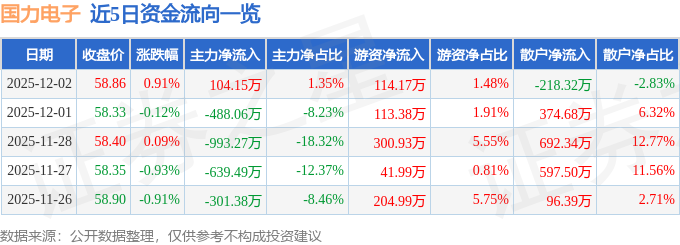 证券之星消息,截至2025年12月2日收盘,国力电子(688103)报收于58.86元,上涨0.91%,换手率1.39%,成交量1.32万手,成交额7716.91万元。