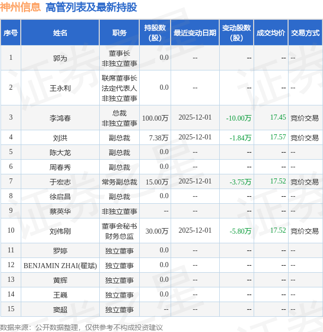 神州信息的高管列表及最新持股情况如下: