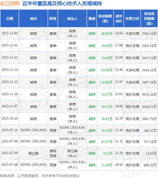 长江材料近半年内的董监高及核心技术人员增减持详情如下: