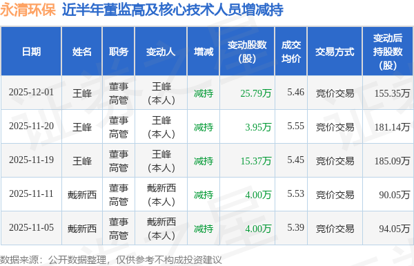 永清环保近半年内的董监高及核心技术人员增减持详情如下: