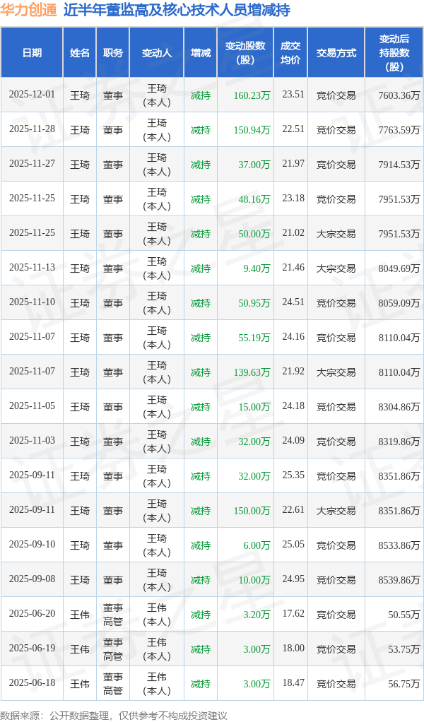华力创通近半年内的董监高及核心技术人员增减持详情如下: