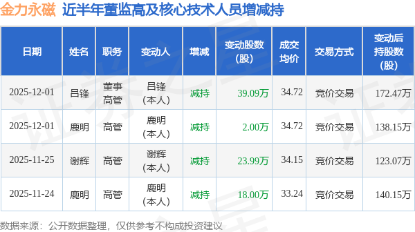 证券之星消息,根据12月2日市场公开信息、上市公司公告及交易所披露数据整理,金力永磁(300748)最新董监高及相关人员股份变动情况:2025年12月1日公司董事,高管吕锋、高管鹿明共减持公司股份41.09万股,占公司总股本为0.0299%。变动期间公司股价上涨3.02%,12月1日当日收盘报34.8元。