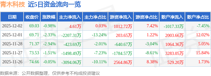 证券之星消息,截至2025年12月2日收盘,青木科技(301110)报收于69.03元,下跌0.98%,换手率3.01%,成交量1.97万手,成交额1.36亿元。