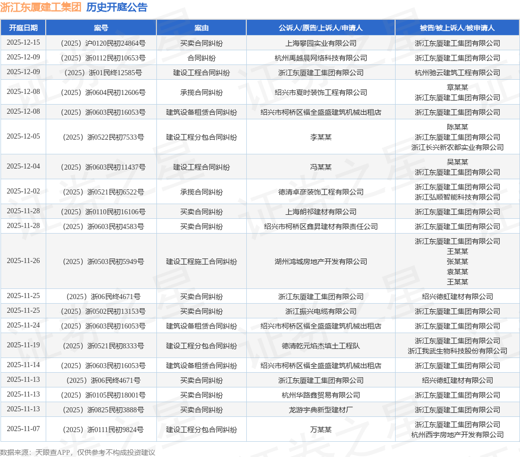 案号:(2025)浙0522民初7533号根据统计,近一年内以浙江东厦建工集团有限公司为当事人的历史开庭公告有142则,其中案由为“买卖合同纠纷”的公告以37则居首,其次为“建设工程施工合同纠纷”有23则,“合同纠纷”有14则。历史开庭公告(前20条)如下: