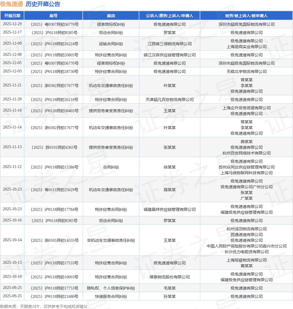 案号:(2025)粤0307民初36770号根据统计,近一年内以极兔速递有限公司为当事人的历史开庭公告有144则,其中案由为“特许经营合同纠纷”的公告以61则居首,其次为“快递服务合同纠纷”有17则,“财产损害赔偿纠纷”有11则。历史开庭公告(前20条)如下: