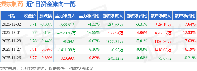证券之星消息,截至2025年12月2日收盘,振东制药(300158)报收于6.71元,下跌0.89%,换手率1.87%,成交量18.54万手,成交额1.24亿元。