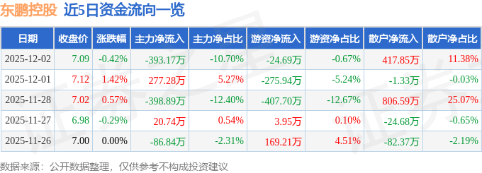 证券之星消息,截至2025年12月2日收盘,东鹏控股(003012)报收于7.09元,下跌0.42%,换手率0.45%,成交量5.18万手,成交额3673.27万元。