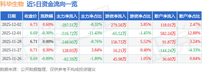 证券之星消息,截至2025年12月2日收盘,科华生物(002022)报收于6.73元,上涨0.6%,换手率1.39%,成交量7.15万手,成交额4775.97万元。