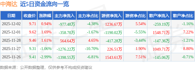 12月2日的资金流向数据方面,主力资金净流出977.48万元,占总成交额4.38%,游资资金净流入1236.67万元,占总成交额5.54%,散户资金净流出259.19万元,占总成交额1.16%。