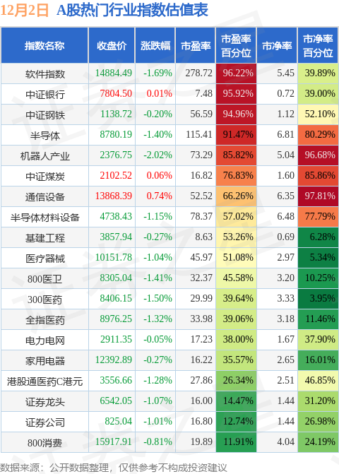 热门行业指数方面,软件指数的市盈率百分位较高,为96.22%。而800消费的市盈率百分位较低,为11.91%。