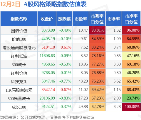 风格策略指数方面,国信价值的市盈率百分位较高,为98.81%。而成长100的市盈率百分位较低,为62.78%。