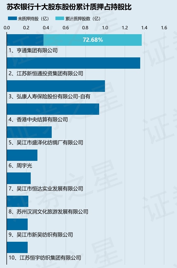 截止本公告日,股东亨通集团有限公司已累计质押股份9990.0万股,占其持股总数的72.68%。本次质押后苏农银行十大股东的累计质押股份占持股比例(占持股比例的计算以公司最新一期财务报表公布的十大股东的持股总数为基准)见下图: