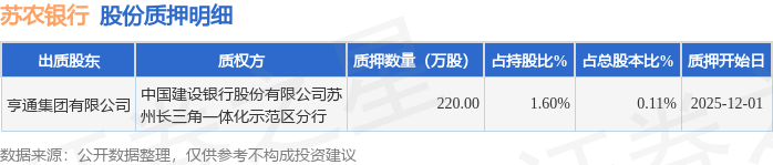 证券之星消息,苏农银行(603323)12月3日公开信息显示,股东亨通集团有限公司向中国建设银行股份有限公司苏州长三角一体化示范区分行合计质押220.0万股,占总股本0.11%。质押详情见下表: