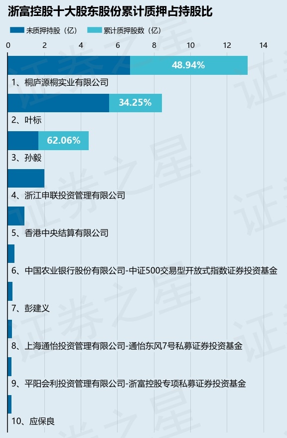 截止本公告日,股东桐庐源桐实业有限公司已累计质押股份6.42亿股,占其持股总数的48.94%,股东叶标已累计质押股份2.89亿股,占其持股总数的34.25%,股东孙毅已累计质押股份2.76亿股,占其持股总数的62.06%。本次质押后浙富控股十大股东的累计质押股份占持股比例(占持股比例的计算以公司最新一期财务报表公布的十大股东的持股总数为基准)见下图: