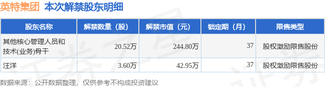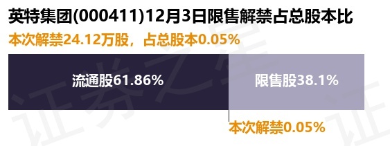 证券之星消息,根据市场公开信息整理,英特集团(000411)于12月3日将有24.12万股限售股份解禁,为公司股权激励限售股份,占公司总股本0.05%。(本次数据根据历史公告整理得出,实际情况以上市公司最新公告为准)最近一年内,该股累计解禁221.26万股,占总股本的0.42%。本次解禁后,公司还有1.99亿股限售股份,占总股本38.1%。具体如下图所示: