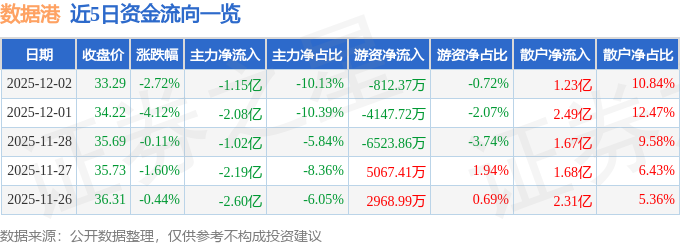 证券之星消息,截至2025年12月2日收盘,数据港(603881)报收于33.29元,下跌2.72%,换手率4.7%,成交量33.74万手,成交额11.32亿元。