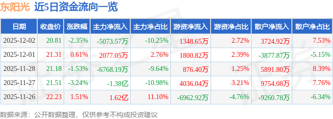 证券之星消息,截至2025年12月2日收盘,东阳光(600673)报收于20.81元,下跌2.35%,换手率0.79%,成交量23.72万手,成交额4.95亿元。