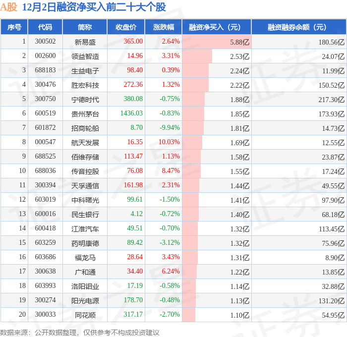 A股融资净买入前三分别为:新易盛(300502)融资净买入5.88亿元、领益智造(002600)融资净买入2.53亿元、生益电子(688183)融资净买入2.24亿元,前20具体见下表: