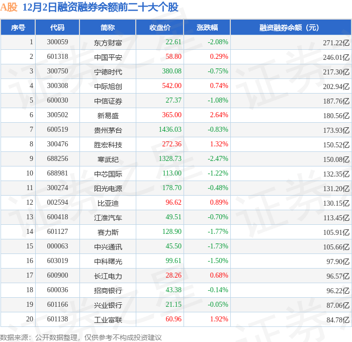 A股融资融券余额前三分别为:东方财富(300059)融资融券余额271.22亿元、中国平安(601318)融资融券余额246.01亿元、宁德时代(300750)融资融券余额217.3亿元,前20具体见下表: