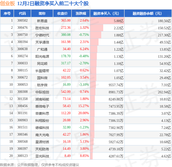 创业板融资净买入前三分别为:新易盛(300502)融资净买入5.88亿元、胜宏科技(300476)融资净买入2.22亿元、宁德时代(300750)融资净买入1.88亿元,前20具体见下表: