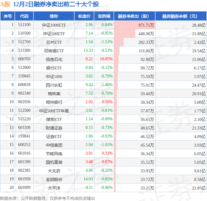 A股融券净卖出前三分别为:中证1000ETF(512100)融券净卖出871.71万股、中证500ETF(510500)融券净卖出448.98万股、芯片ETF(512760)融券净卖出202.33万股,前20具体见下表: