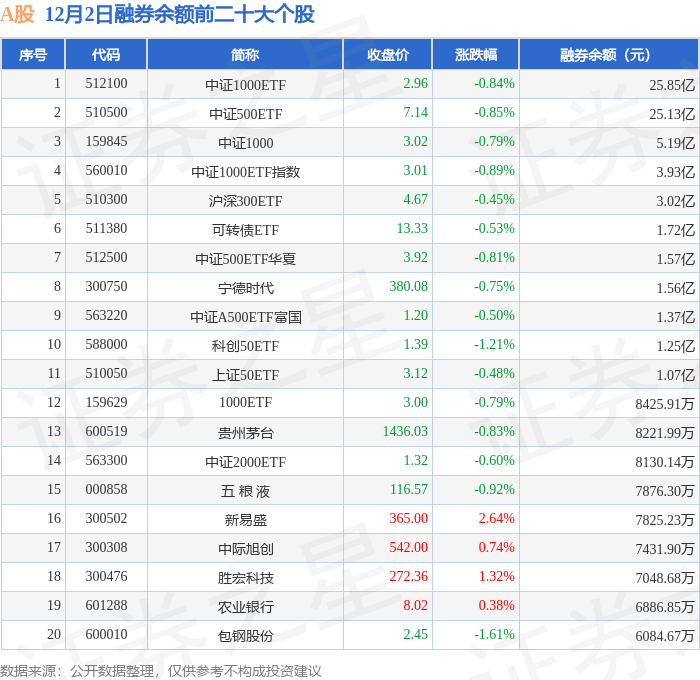 A股融券余额前三分别为:中证1000ETF(512100)融券余额25.85亿元、中证500ETF(510500)融券余额25.13亿元、中证1000(159845)融券余额5.19亿元,前20具体见下表: