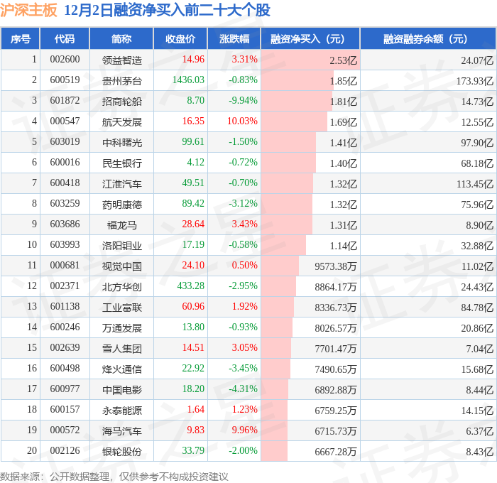 沪深主板融资净买入前三分别为:领益智造(002600)融资净买入2.53亿元、贵州茅台(600519)融资净买入1.85亿元、招商轮船(601872)融资净买入1.81亿元,前20具体见下表: