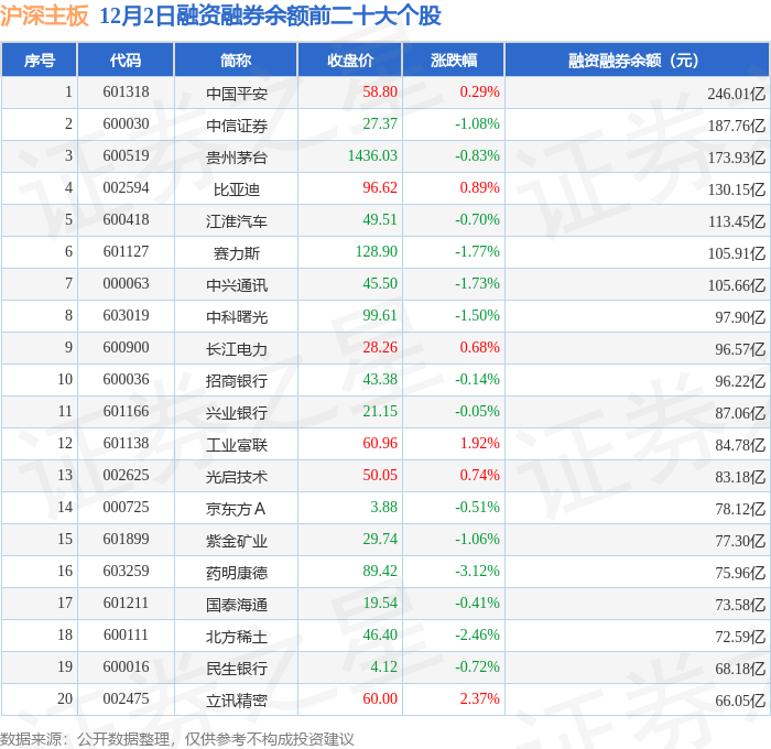 沪深主板融资融券余额前三分别为:中国平安(601318)融资融券余额246.01亿元、中信证券(600030)融资融券余额187.76亿元、贵州茅台(600519)融资融券余额173.93亿元,前20具体见下表:
