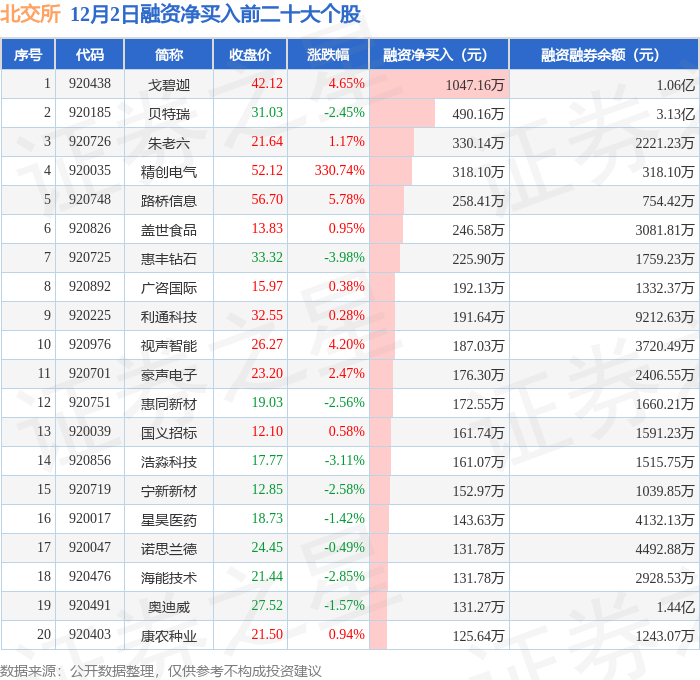 北交所融资净买入前三分别为:戈碧迦(920438)融资净买入1047.16万元、贝特瑞(920185)融资净买入490.16万元、朱老六(920726)融资净买入330.14万元,前20具体见下表: