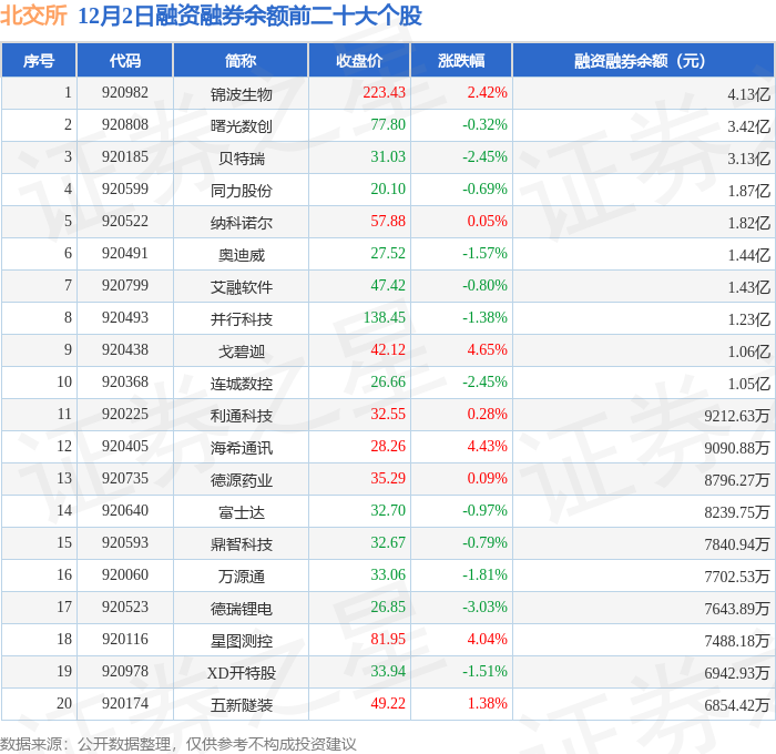 北交所融资融券余额前三分别为:锦波生物(920982)融资融券余额4.13亿元、曙光数创(920808)融资融券余额3.42亿元、贝特瑞(920185)融资融券余额3.13亿元,前20具体见下表: