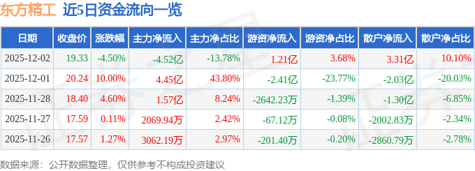 证券之星消息,截至2025年12月2日收盘,东方精工(002611)报收于19.33元,下跌4.5%,换手率16.61%,成交量166.51万手,成交额32.77亿元。